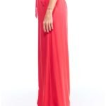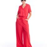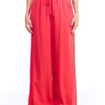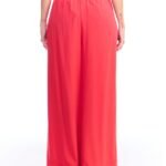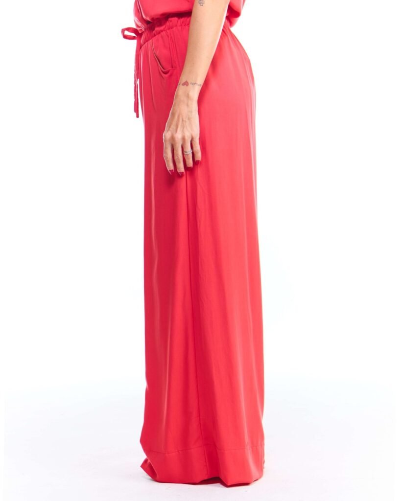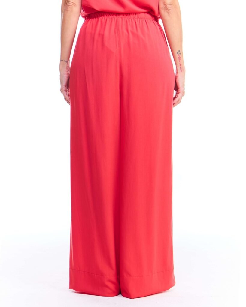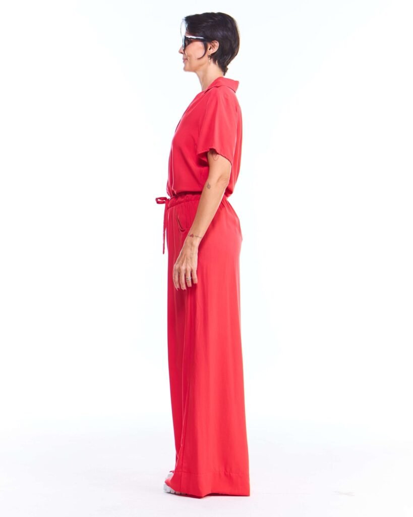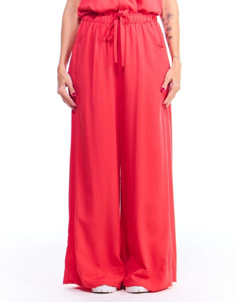 A calça pantalona vermelha viscose possui pernas amplas, cintura alta, cós de elástico com cordão de ajuste e bolsos embutidos nas laterais da frente; unindo perfeitamente fluidez, estilo e conforto.