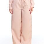 A calça pantalona bege linho fake de poliéster possui pernas amplas, cintura alta, cós de elástico com cordão de ajuste e bolsos embutidos nas laterais da frente; unindo perfeitamente fluidez, estilo e conforto.
