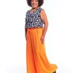 A calça pantalona laranja viscose possui pernas amplas, cintura alta, cós de elástico com cordão de ajuste e bolsos embutidos nas laterais da frente; unindo perfeitamente fluidez, estilo e conforto.