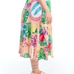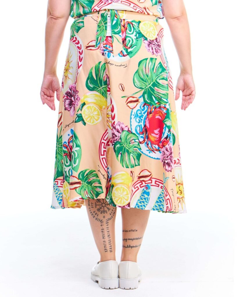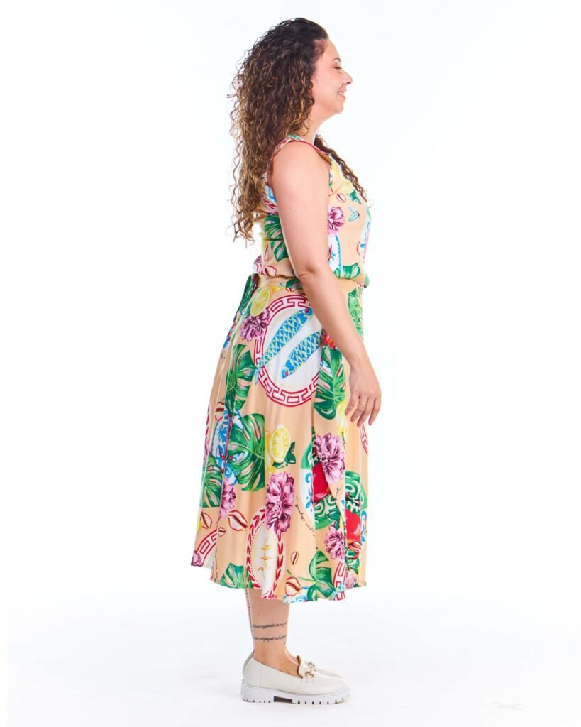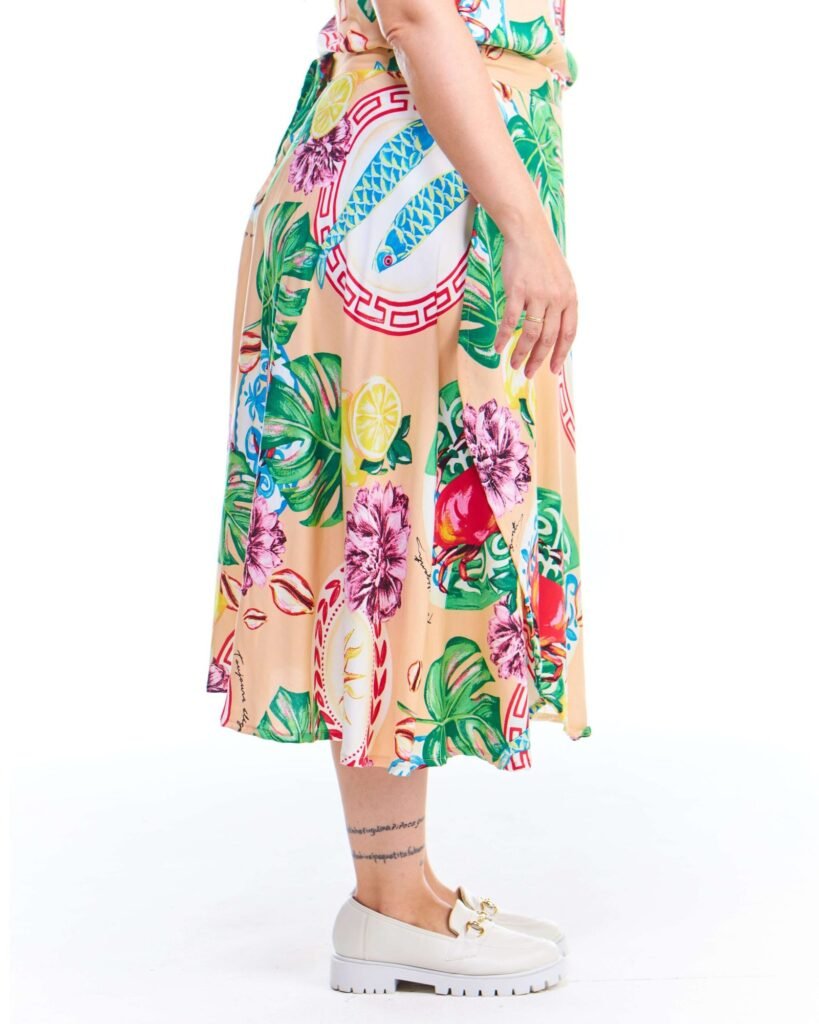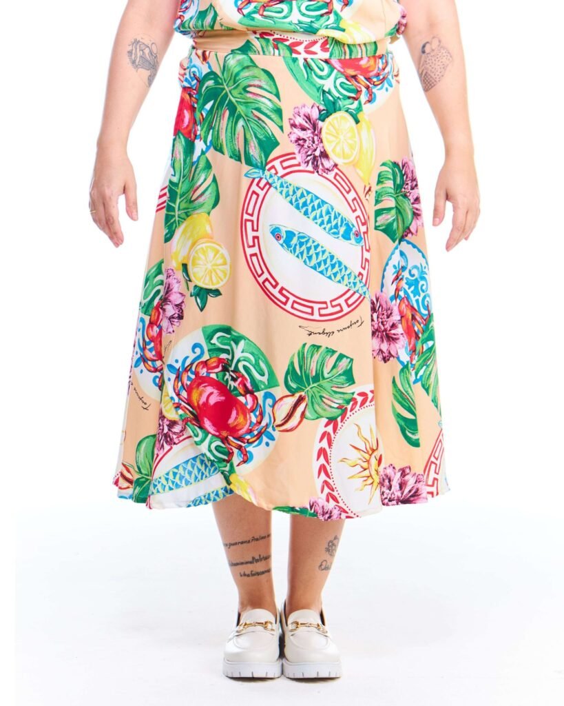A saia pareô estampada salmão midi viscose possui modelagem godê, cós de amarração com passantes, comprimento midi e é feita em tecido 100% viscose; unindo perfeitamente fluidez, estilo e conforto.