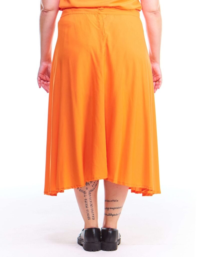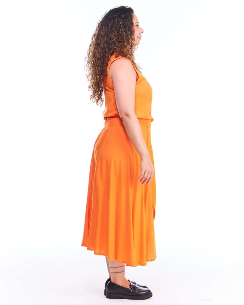 A saia pareô laranja midi viscose possui modelagem godê, cós de amarração com passantes, comprimento midi e é feita em tecido 100% viscose; unindo perfeitamente fluidez, estilo e conforto.