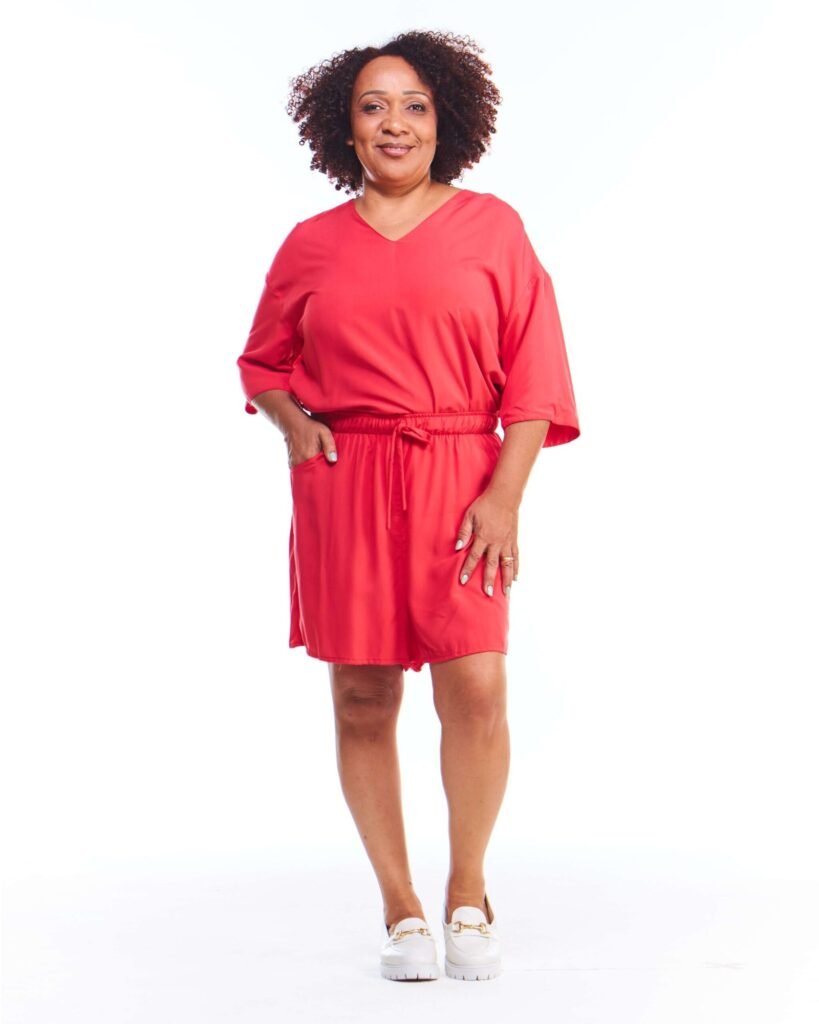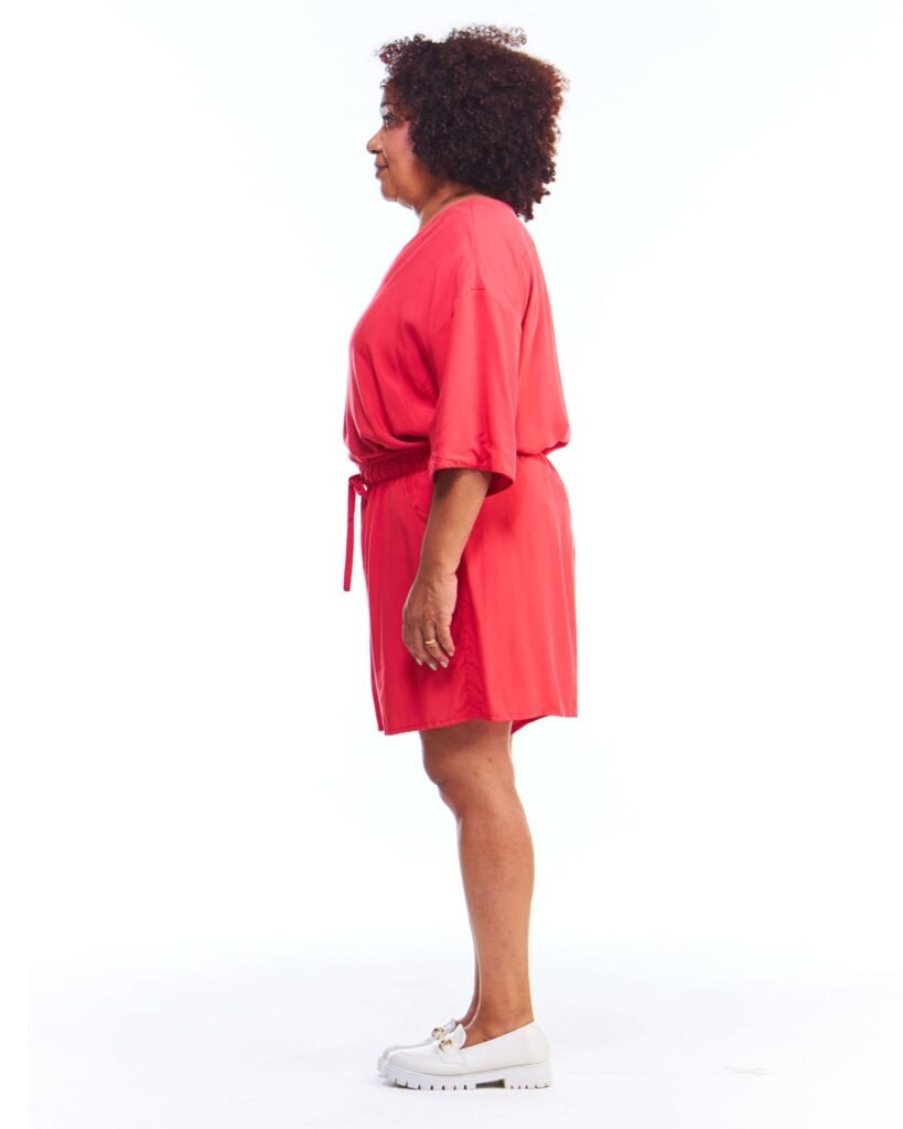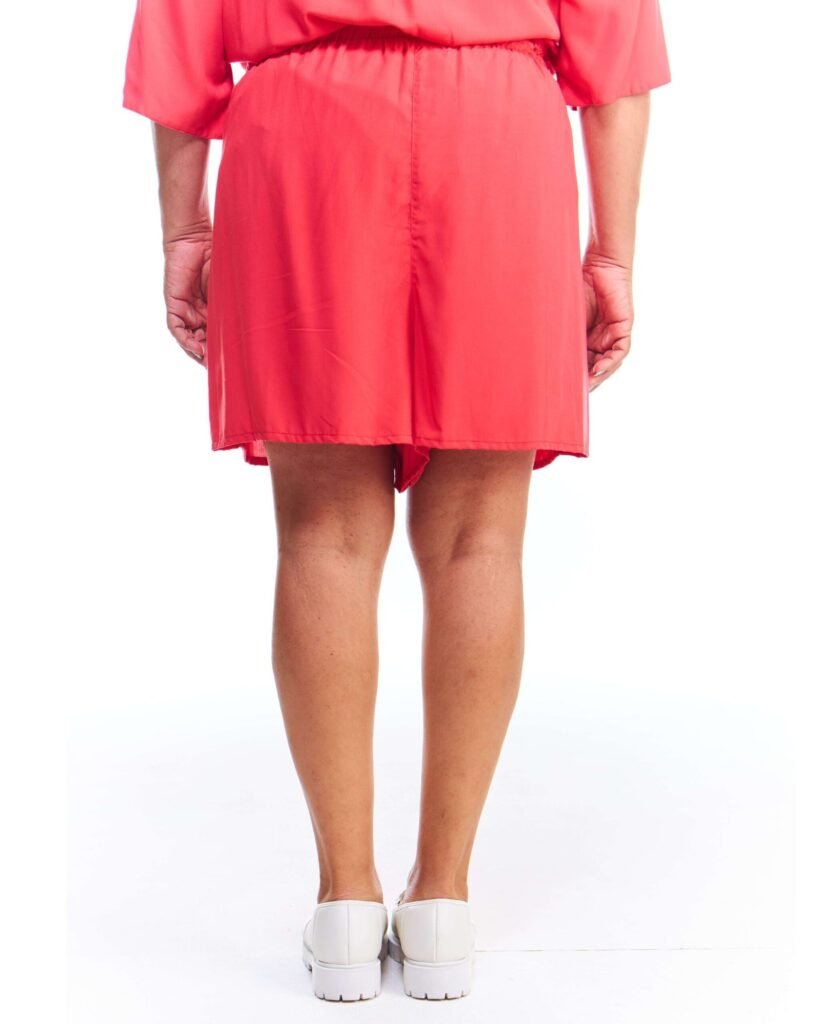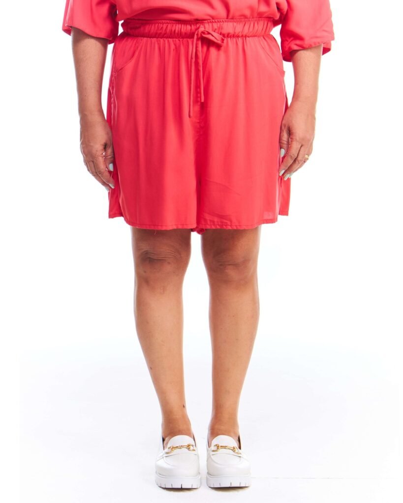 A bermuda viscose feminina vermelha possui pernas amplas, cintura alta, cós de elástico com cordão de ajuste e bolsos embutidos nas laterais da frente; unindo perfeitamente fluidez, estilo e conforto.