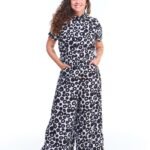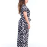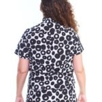 A camisa feminina viscose estampada branca manga curta possui comprimento até o quadril, mangas curtas, fechamento de botões, pregas nas costas e é feita em tecido 100% viscose.