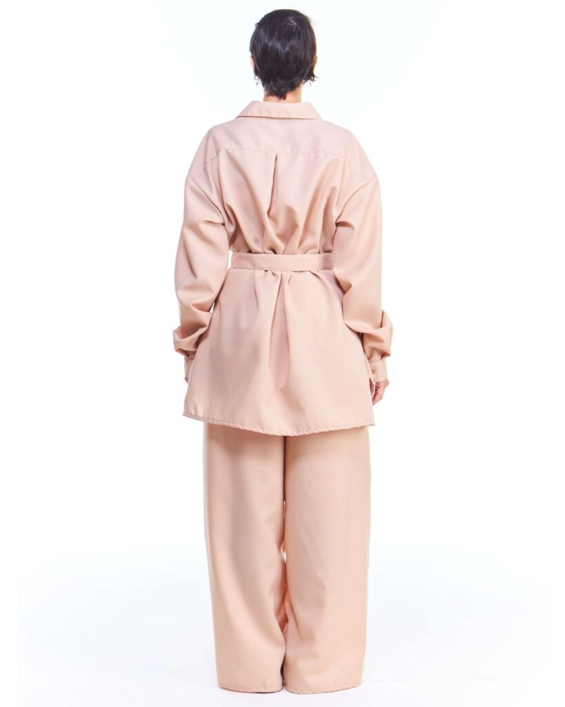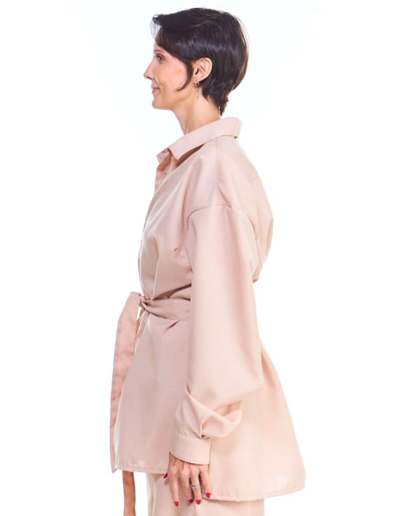 A camisa oversized feminina linho fake bege manga longa possui comprimento acima do joelho, mangas longas, fechamento de botões na frente e nos punhos, pregas nas costas, acompanha faixa de amarração para a cintura e é feita em tecido 100% poliéster.