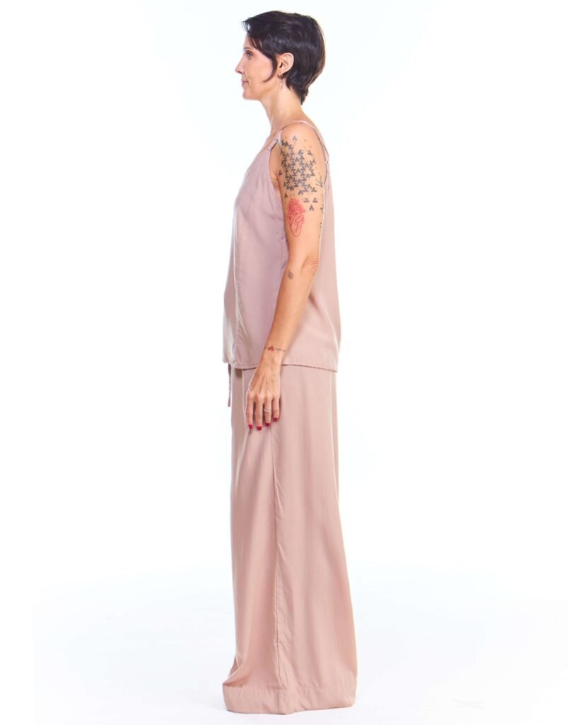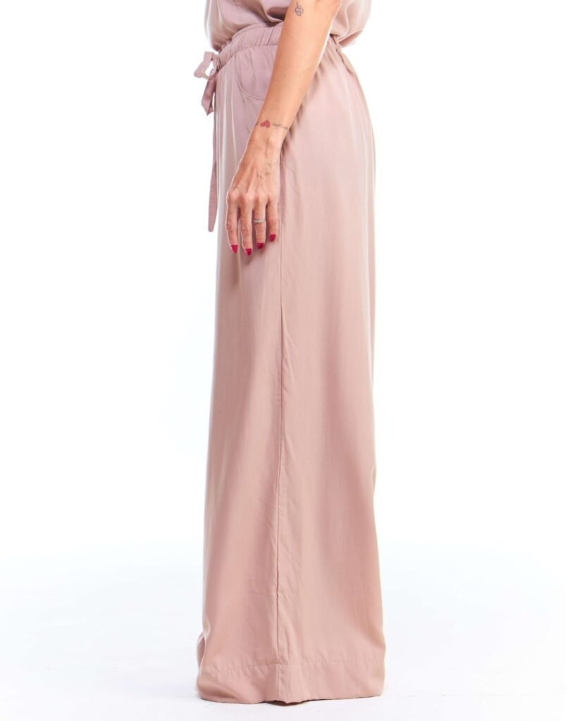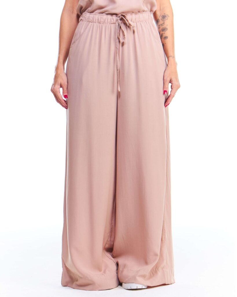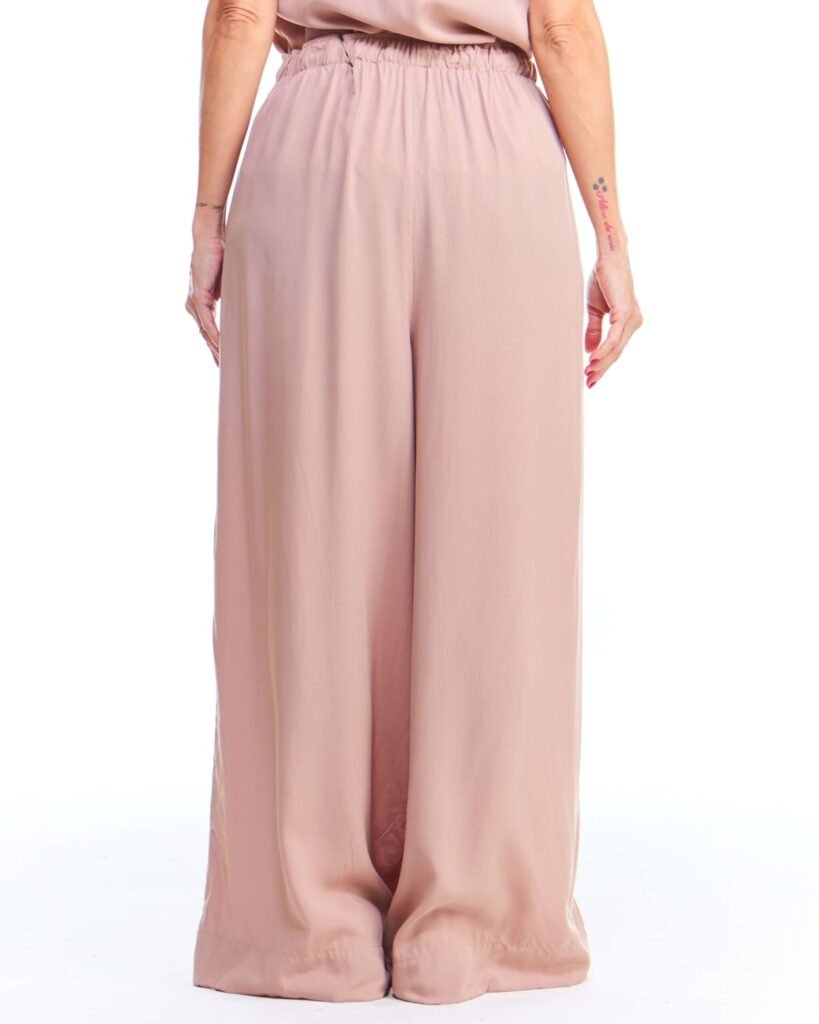 A calça pantalona off white viscose possui pernas amplas, cintura alta, cós de elástico com cordão de ajuste e bolsos embutidos nas laterais da frente; unindo perfeitamente fluidez, estilo e conforto.