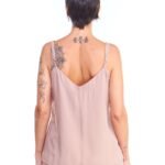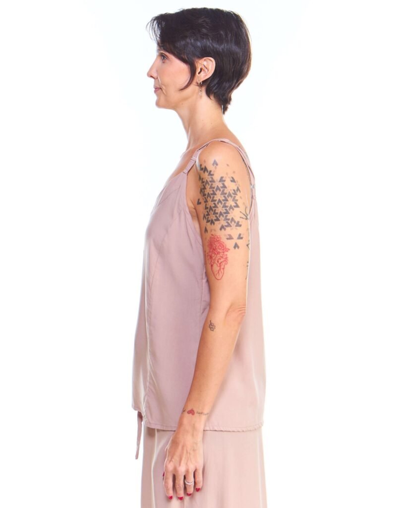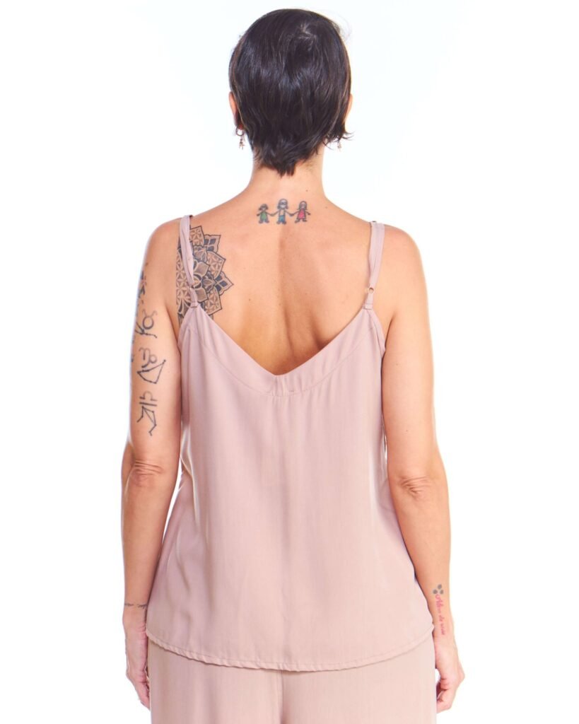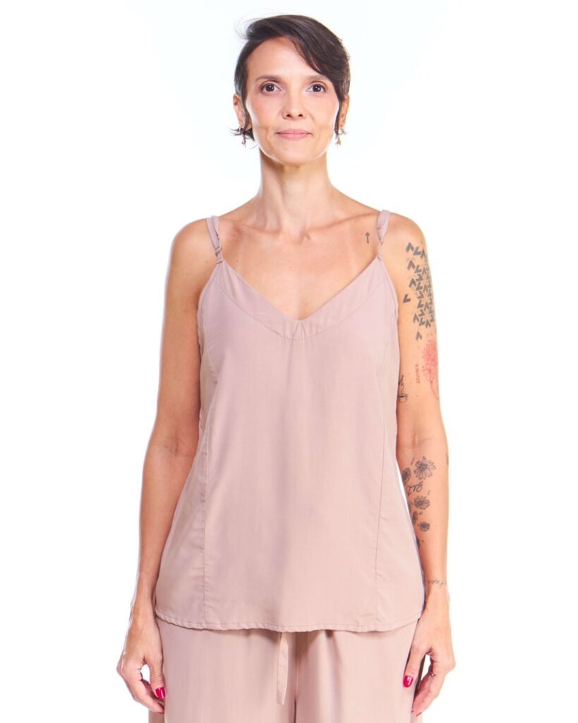 A blusa de alça off white de viscose comprimento até o quadril, alças reguláveis, gola v, recorte princesa na frente e é feita em tecido 100% viscose.