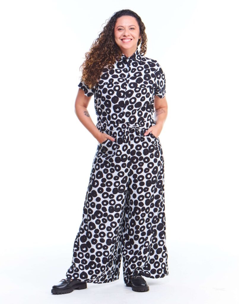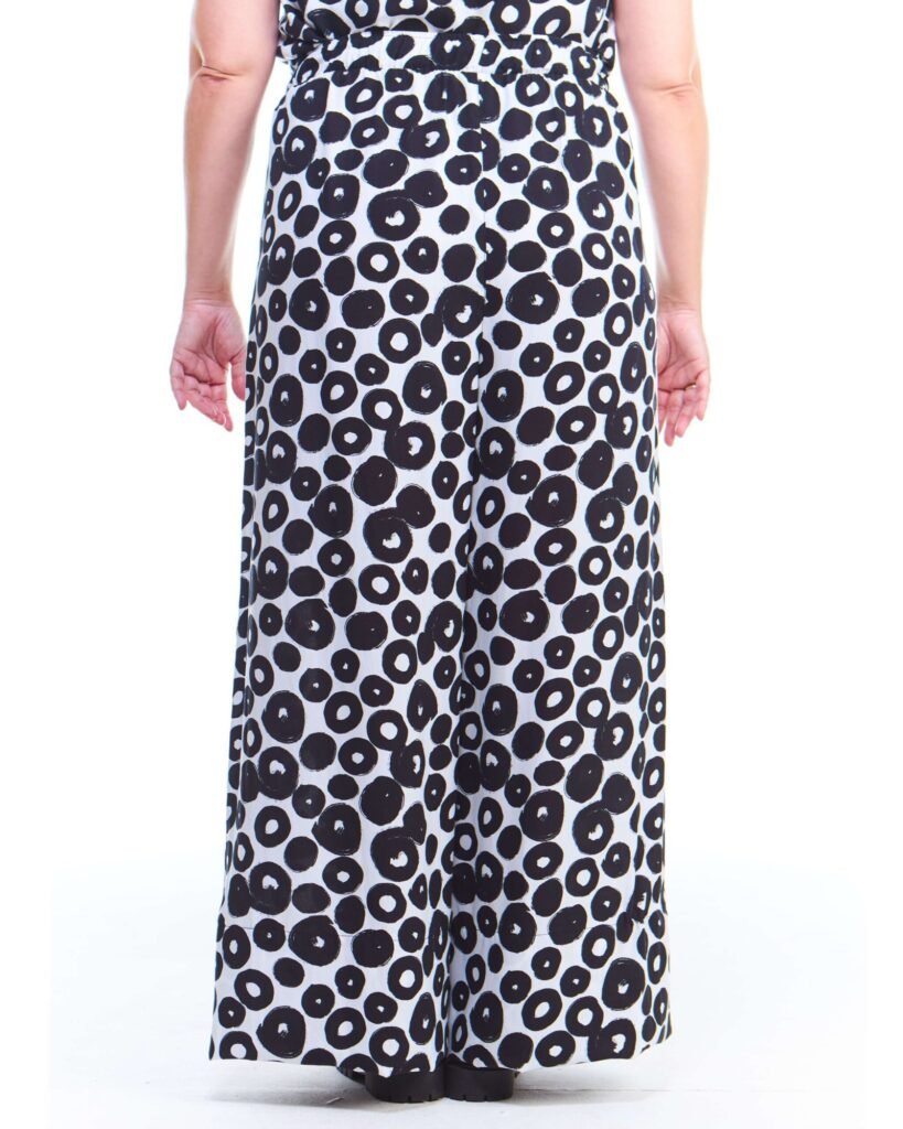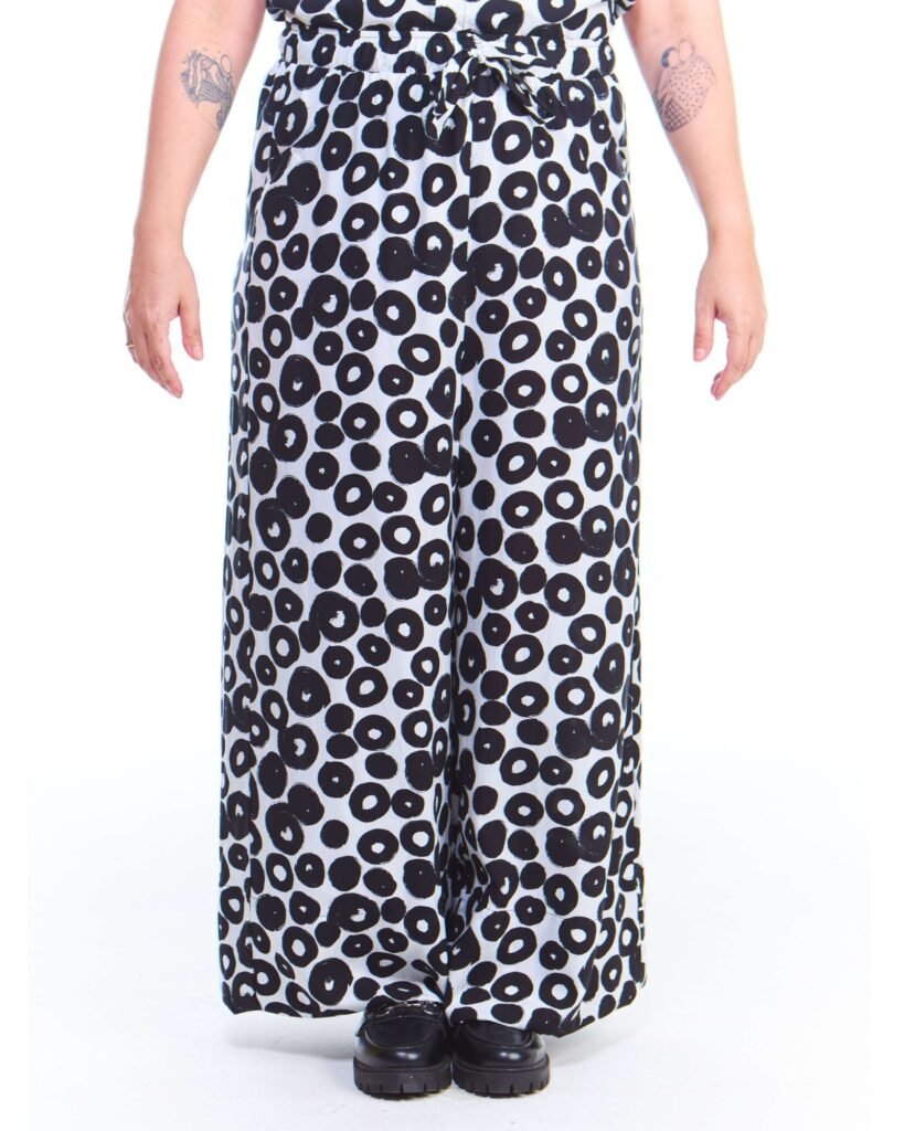 A calça pantalona branca estampada viscose possui pernas amplas, cintura alta, cós de elástico com cordão de ajuste e bolsos embutidos nas laterais da frente e é feita em tecido 100% viscose.