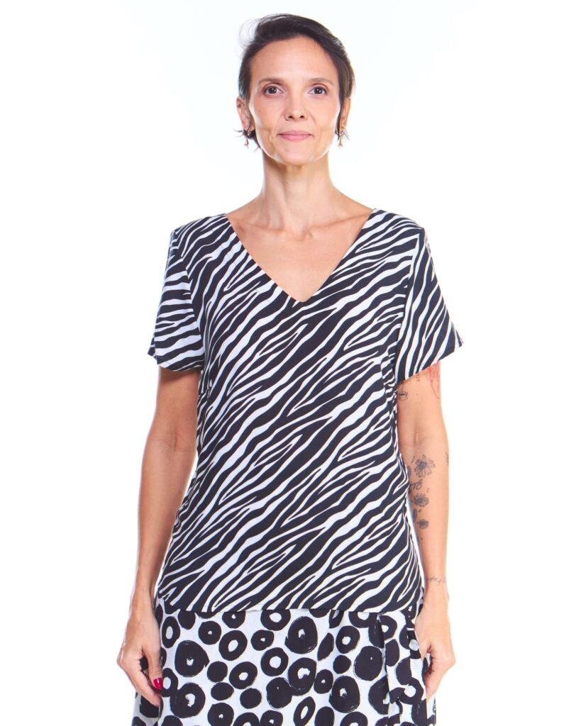 A blusa feminina estampada preta de viscose manga curta possui comprimento até o quadril, gola v, mangas curtas, pences de busto na frente e é feita em tecido 100% viscose.