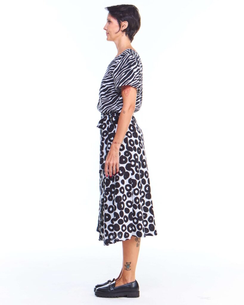 A saia pareô estampada branca midi viscose possui modelagem godê, cós de amarração com passantes, comprimento midi e é feita em tecido 100% viscose; unindo perfeitamente fluidez, estilo e conforto.