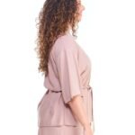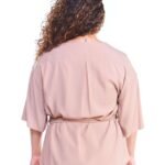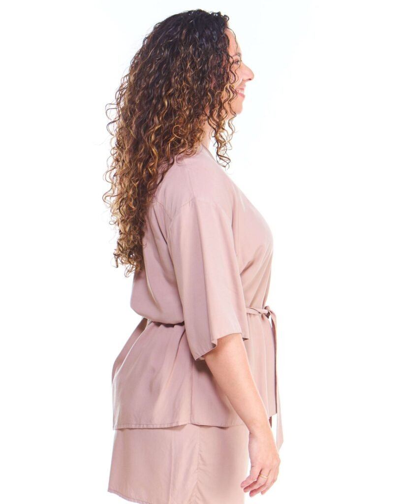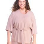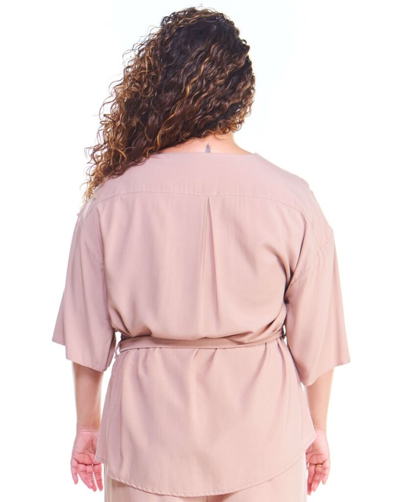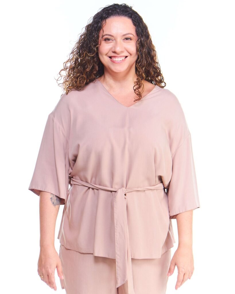 A blusa oversized feminina off white de viscose manga 3/4 possui comprimento até na coxa, gola v, mangas 3/4, pences de busto na frente, acompanha faixa de amarração para a cintura e é feita em tecido 100% viscose.