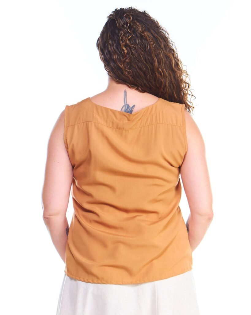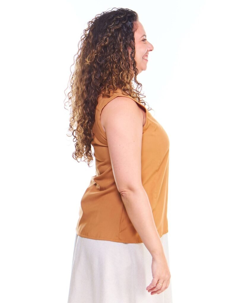 A regata feminina bege de viscose apresenta um design pensado para valorizar a silhueta com leveza e delicadeza. A gola V alonga a região do colo e destaca o pescoço, trazendo um toque elegante ao visual. Já o recorte princesa na parte frontal contribui para um caimento mais ajustado, realçando suavemente as curvas e proporcionando um visual feminino e equilibrado.