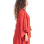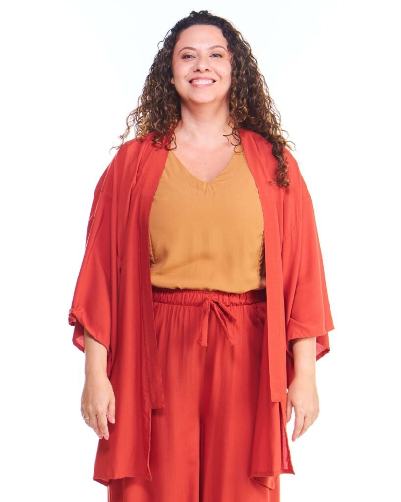 A abertura frontal é um convite à criatividade na hora de vestir: o kimono feminino viscose terracota pode ser usado solto, como terceira peça que arremata o visual com elegância, ou amarrado na cintura com a faixa que o acompanha, criando um efeito mais ajustado e feminino. Com esse design funcional e sofisticado, ele se adapta a diferentes estilos e ocasiões, sendo uma escolha certeira para quem gosta de unir tradição e moda de forma original.