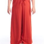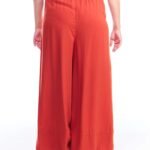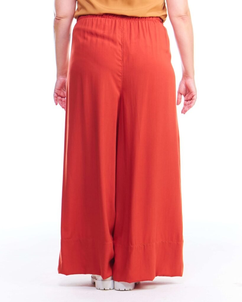 A calça pantalona terracota viscose possui pernas amplas, cintura alta, cós de elástico com cordão de ajuste e bolsos embutidos nas laterais da frente; unindo perfeitamente fluidez, estilo e conforto.