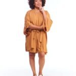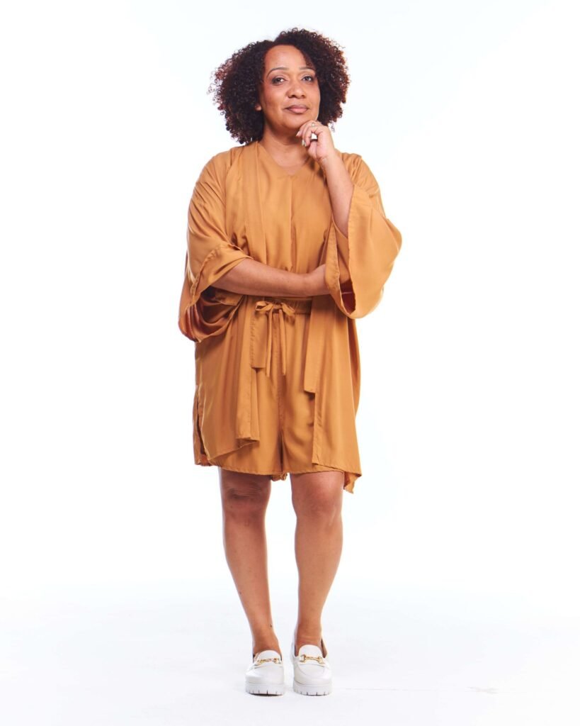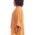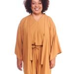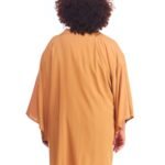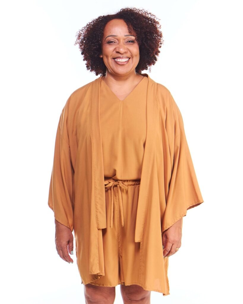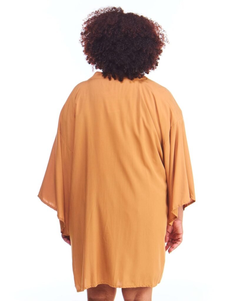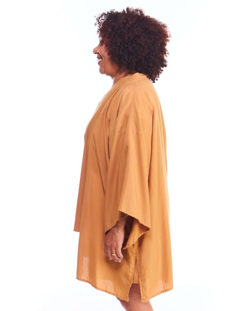 A kimono feminino viscose bege possui modelagem tradicional japonesa, com aberturas abaixo das mangas, silhueta oversize e reta, comprimento acima do joelho, abertura na frente e acompanha faixa de amarração para a cintura.