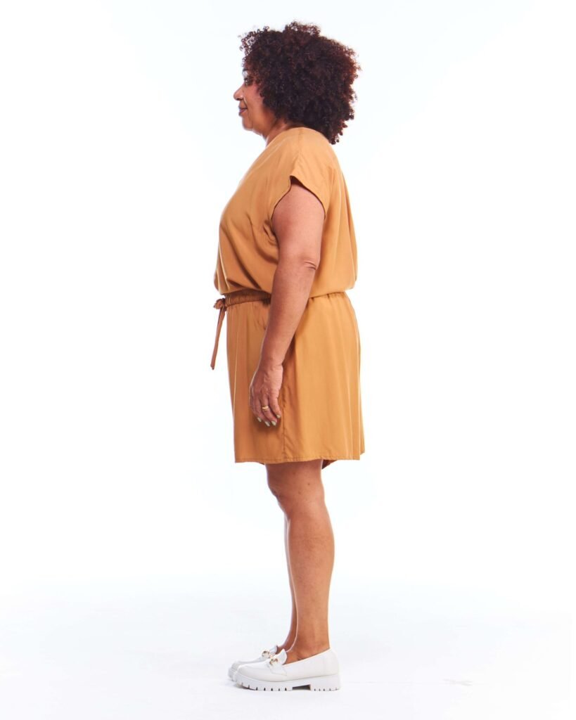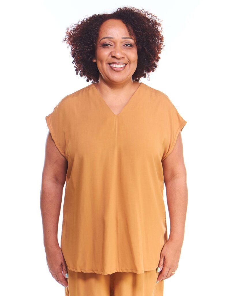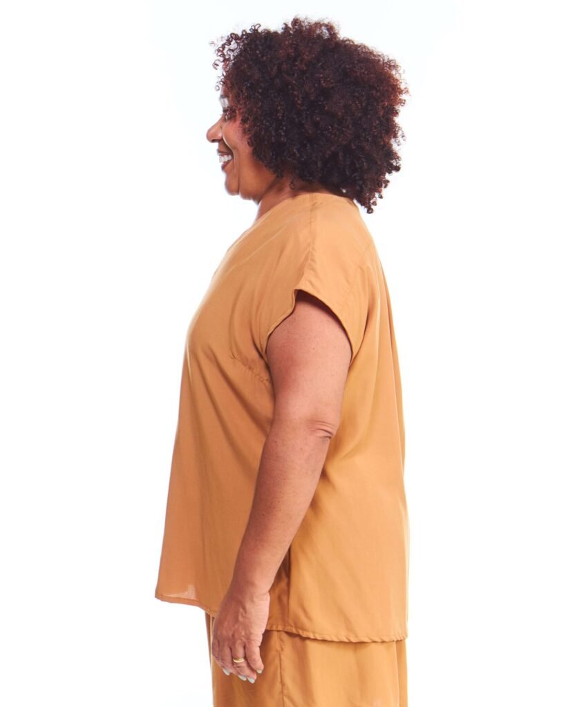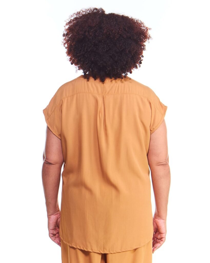 A blusa oversized feminina bege de viscose regata possui comprimento até na coxa, gola v, manga japonesa, pences de busto na frente, acompanha faixa de amarração para a cintura e é feita em tecido 100% viscose.