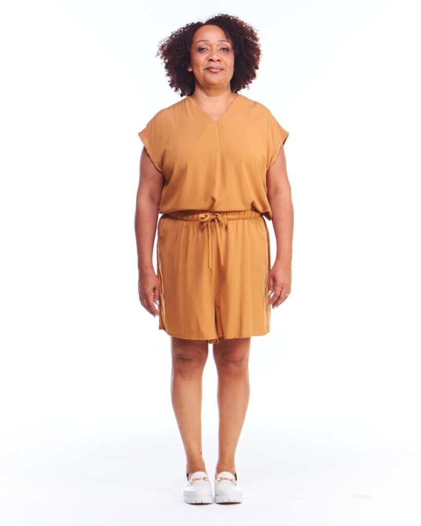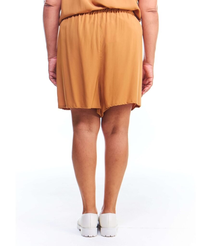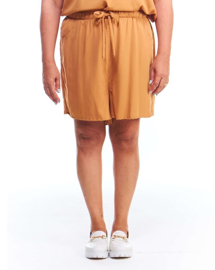 A bermuda viscose feminina bege possui pernas amplas, cintura alta, cós de elástico com cordão de ajuste e bolsos embutidos nas laterais da frente; unindo perfeitamente fluidez, estilo e conforto.