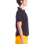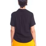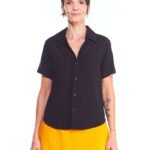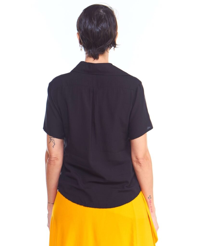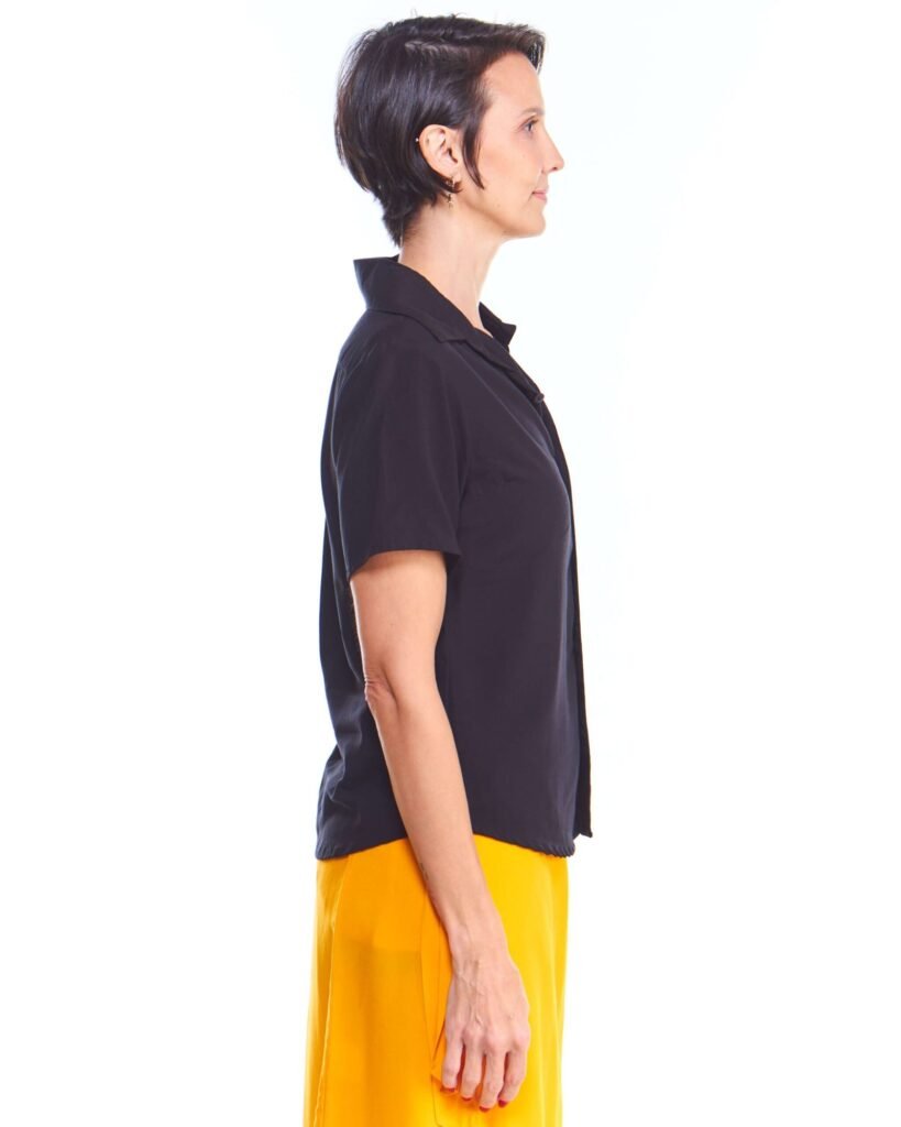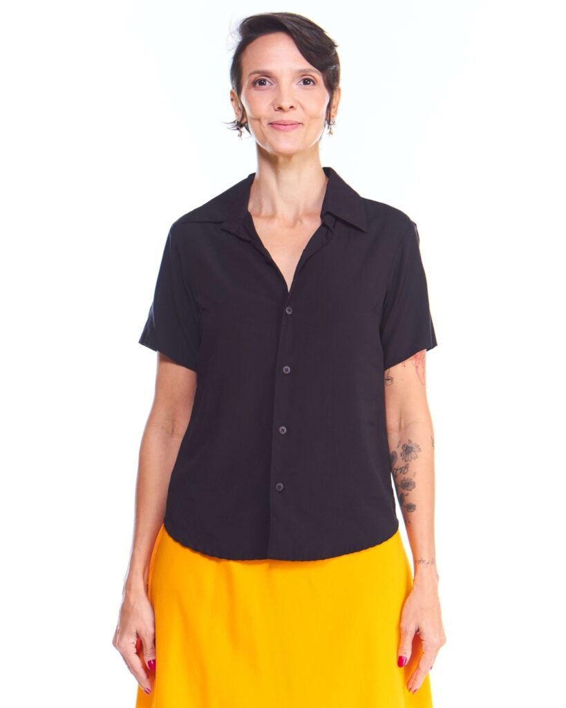 A camisa feminina viscose preta manga curta possui comprimento até o quadril, mangas curtas, fechamento de botões, pregas nas costas e é feita em tecido 100% viscose.