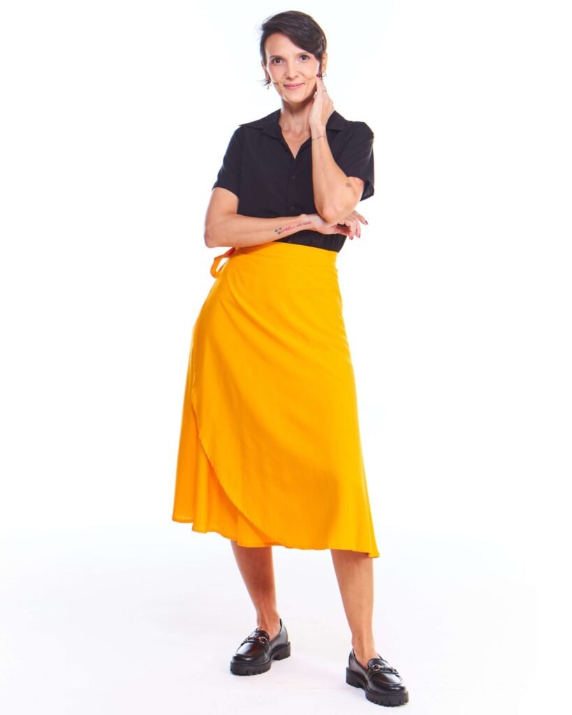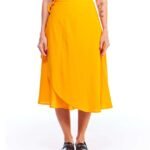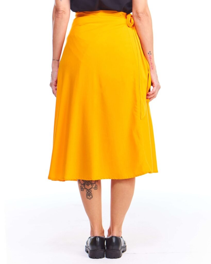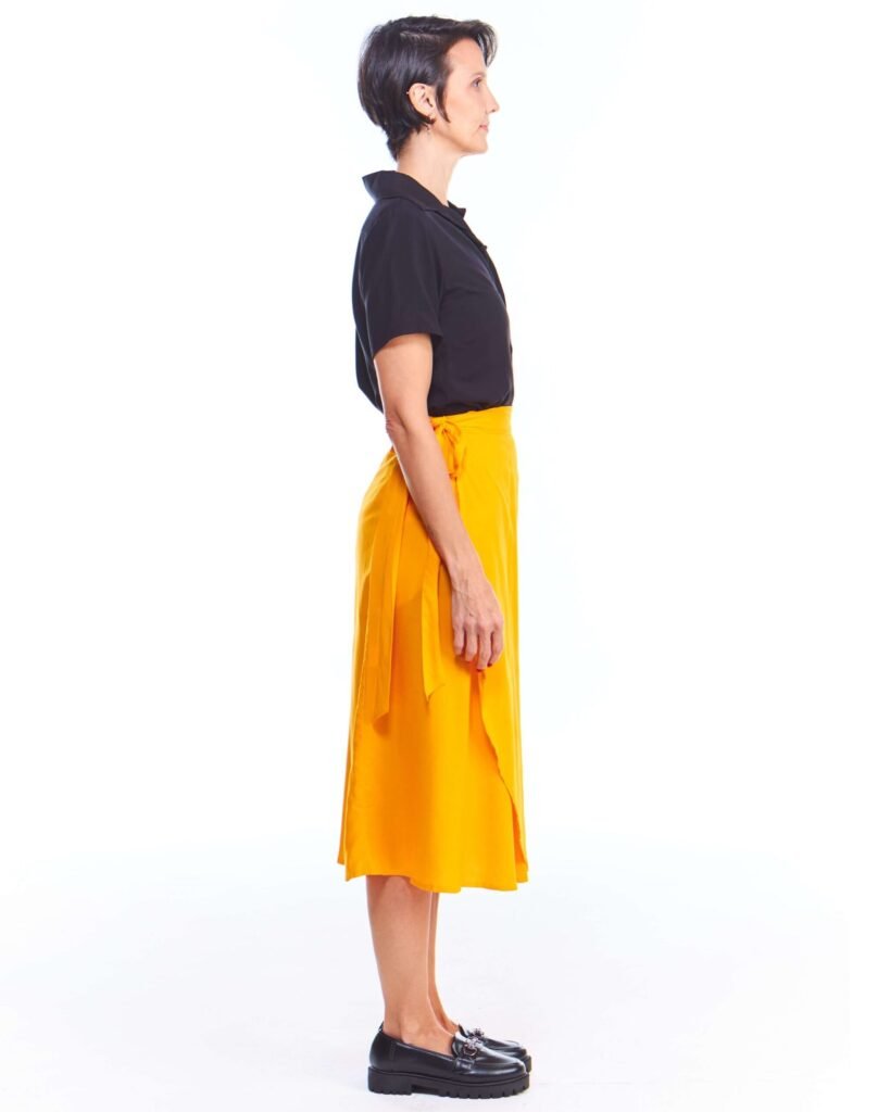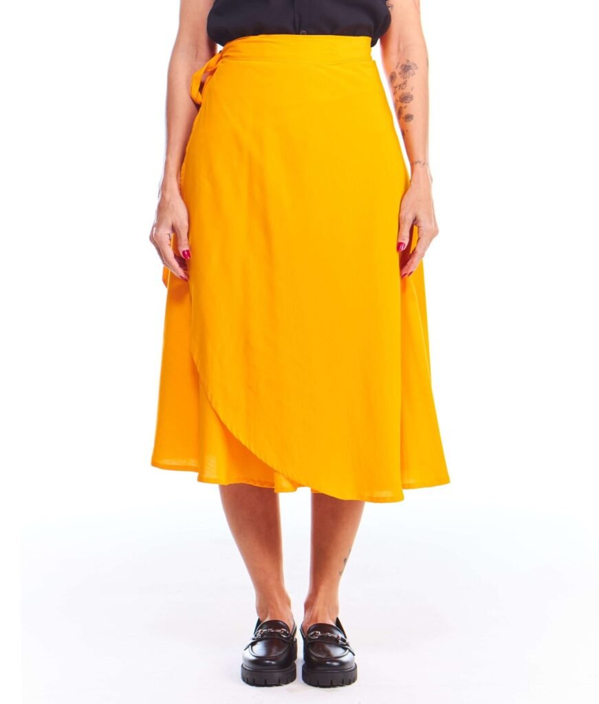 A saia pareô amarela midi viscose possui modelagem godê, cós de amarração com passantes, comprimento midi e é feita em tecido 100% viscose; unindo perfeitamente fluidez, estilo e conforto.