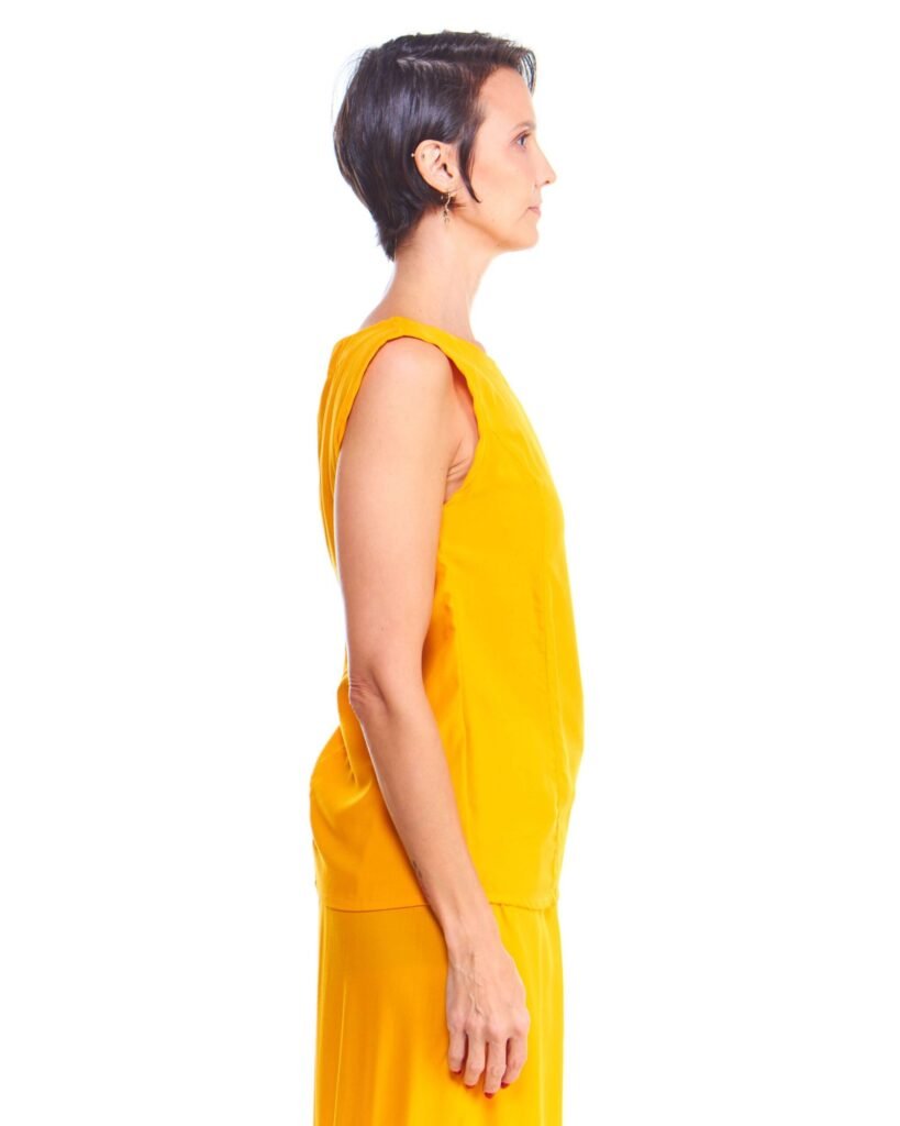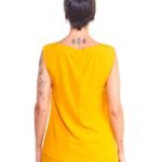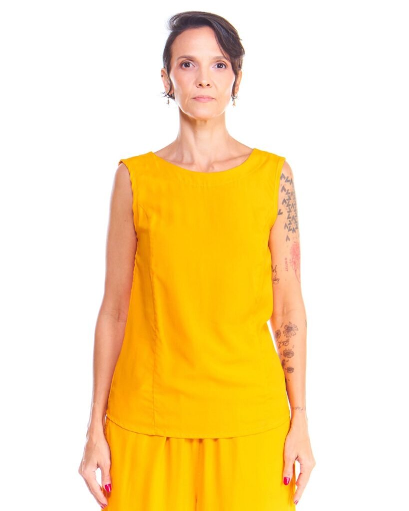 A regata feminina amarela de viscose comprimento até o quadril, gola redonda, recorte princesa na frente e é feita em tecido 100% viscose.