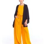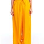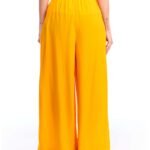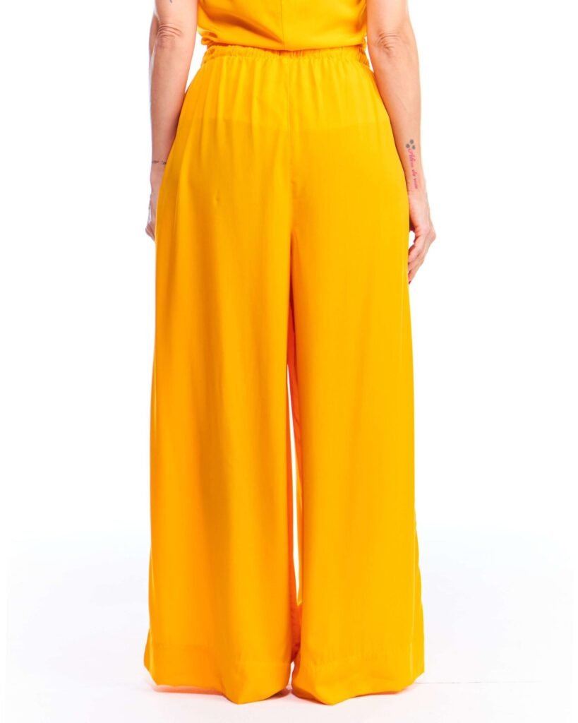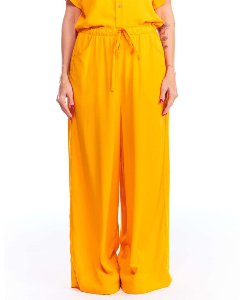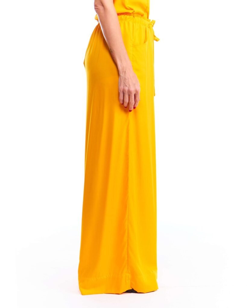 A calça pantalona amarela viscose possui pernas amplas, cintura alta, cós de elástico com cordão de ajuste e bolsos embutidos nas laterais da frente; unindo perfeitamente fluidez, estilo e conforto.