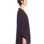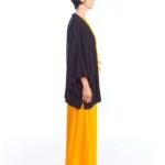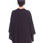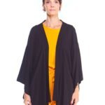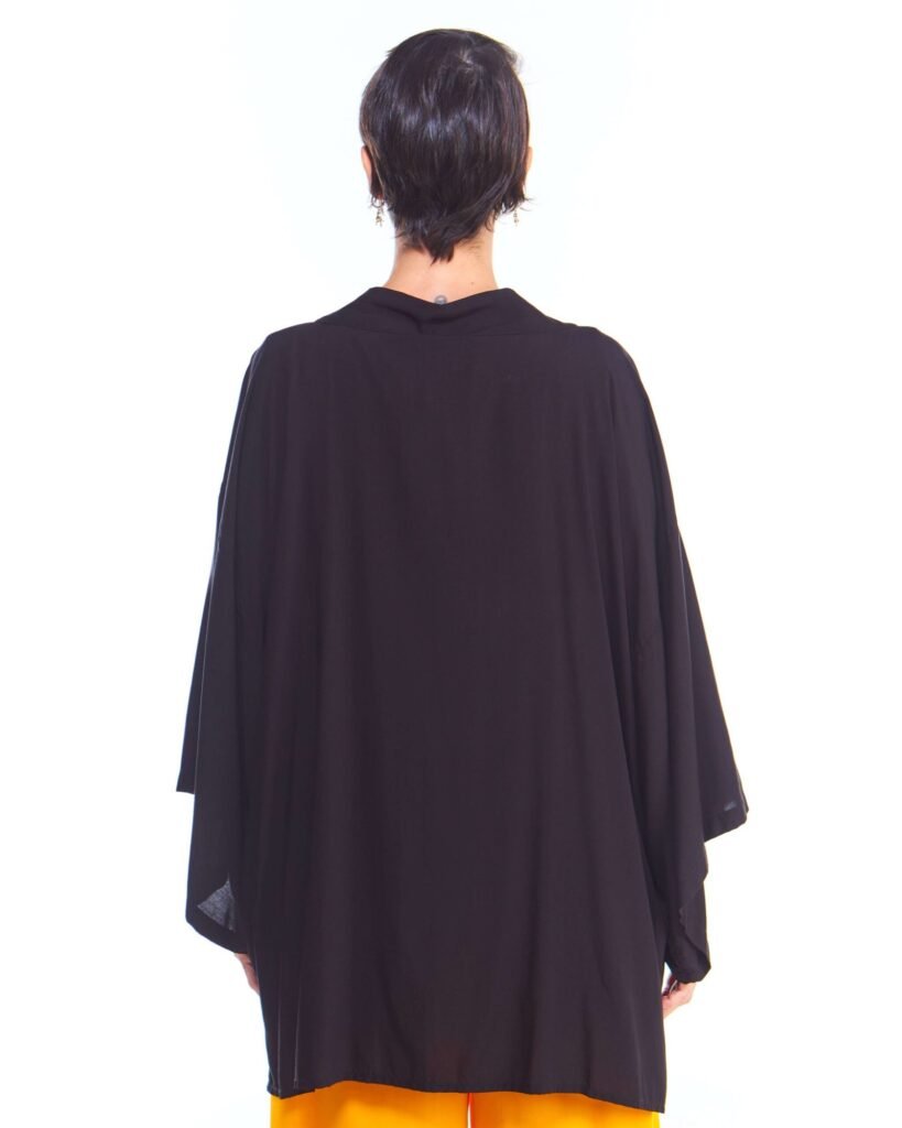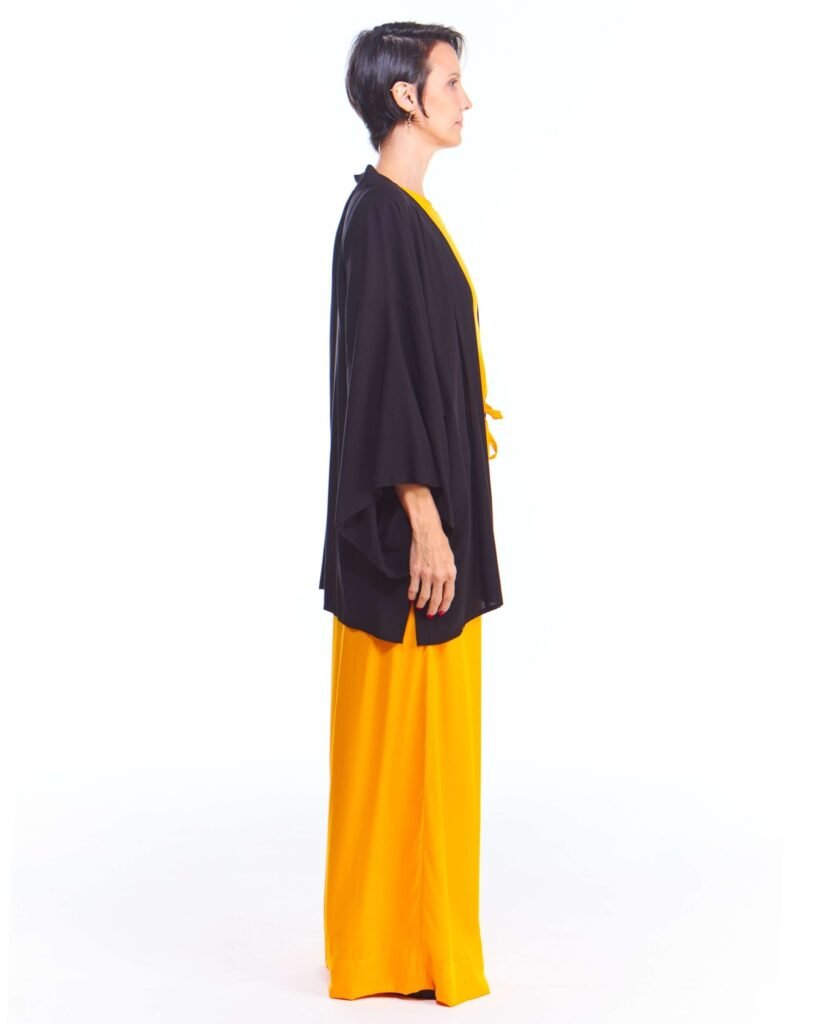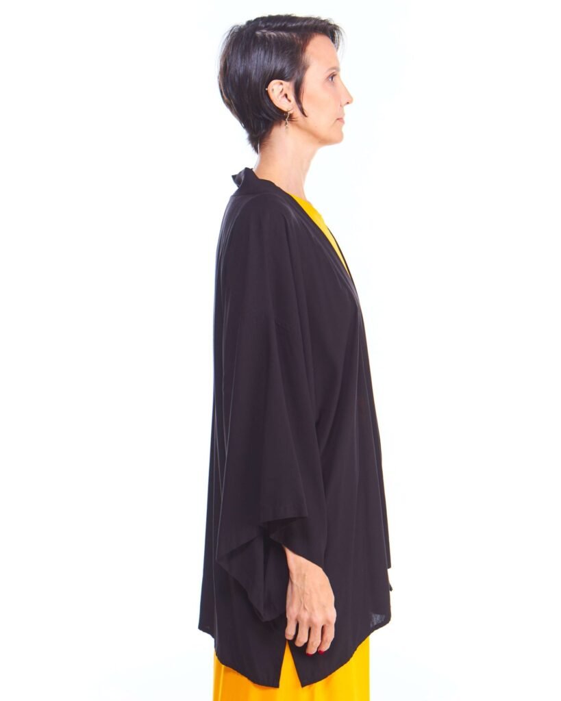 A kimono feminino viscose preto possui modelagem tradicional japonesa, com aberturas abaixo das mangas, silhueta oversize e reta, comprimento acima do joelho, abertura na frente e acompanha faixa de amarração para a cintura.