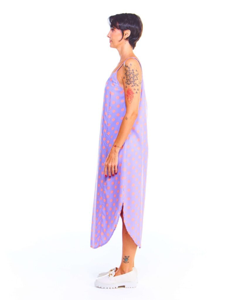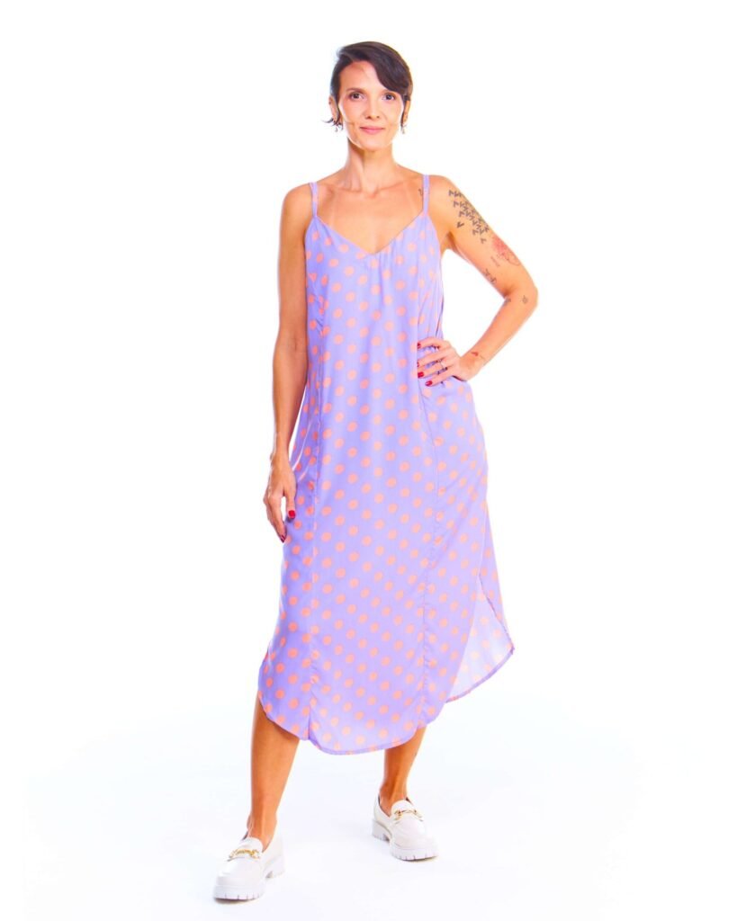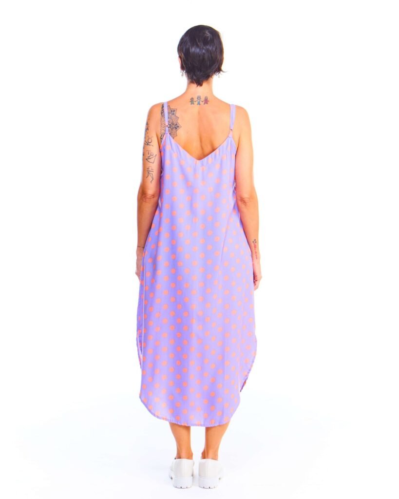O vestido alça estampado lilás midi de viscose possui uma estampa de poá rosa sobre fundo lilás que permite combinações delicadas e cheias de charme. Sandálias em tons nude, branco ou rosa claro harmonizam com a paleta da estampa e mantêm a leveza do look. Para um toque mais elegante, aposte em saltos finos e acessórios dourados ou rosé. Em dias mais frescos, uma sobreposição com jaqueta jeans ou blazer branco complementa o visual com equilíbrio. Bolsas pequenas em tons suaves completam o estilo com romantismo e frescor.