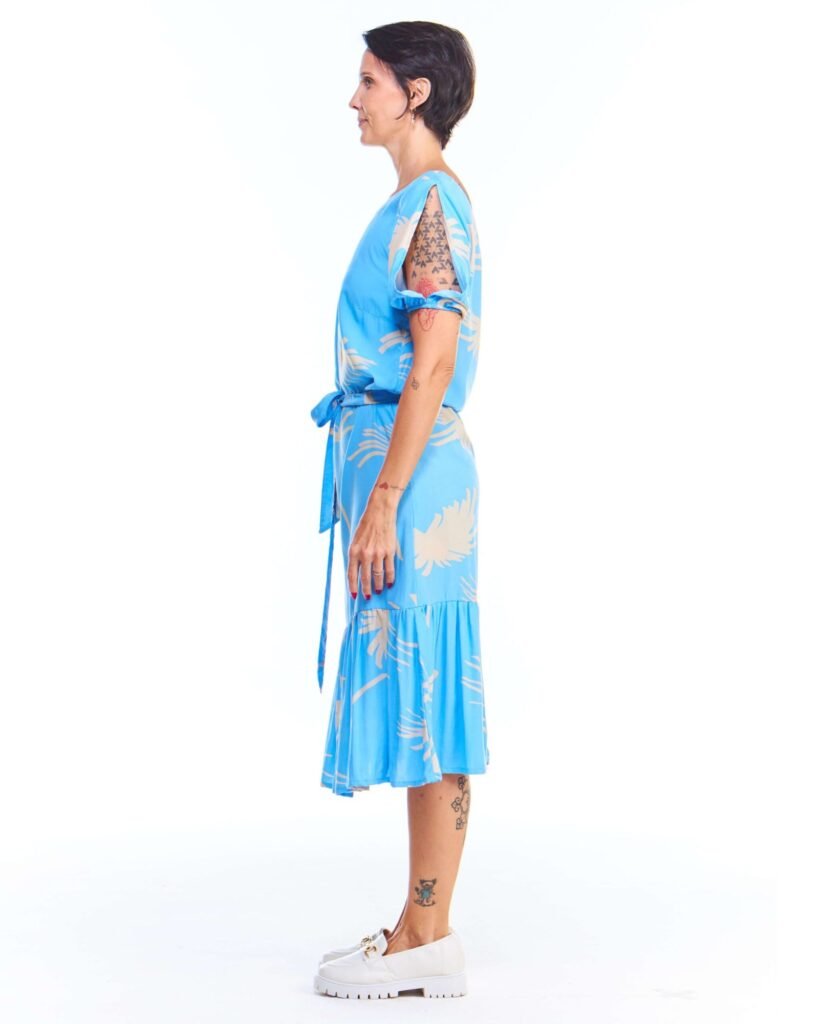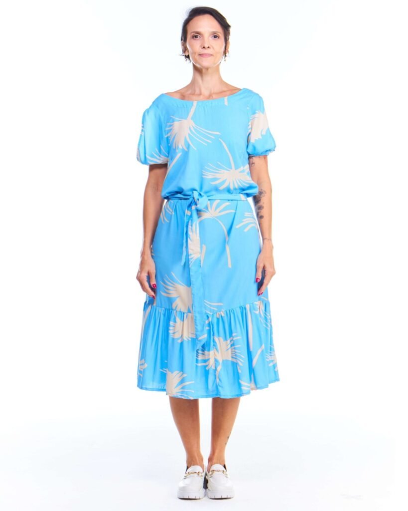 O vestido babado azul estampado é a peça perfeita para quem busca leveza, movimento e feminilidade em um só visual. Com comprimento midi, gola canoa, mangas curtas com fendas e babado na barra, ele conquista pelos detalhes que valorizam o corpo com sutileza. As pences no busto garantem um ajuste elegante, enquanto a faixa de amarração na cintura traz charme extra à composição.