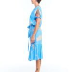 Vestido Babado Azul Estampado Midi Manga Curta Viscose