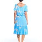 O vestido babado azul estampado é feito em tecido 100% viscose e possui comprimento midi, mangas curtas com fendas, gola canoa, pences de busto, 1 babado nas pernas e acompanha faixa de amarração para a cintura.
