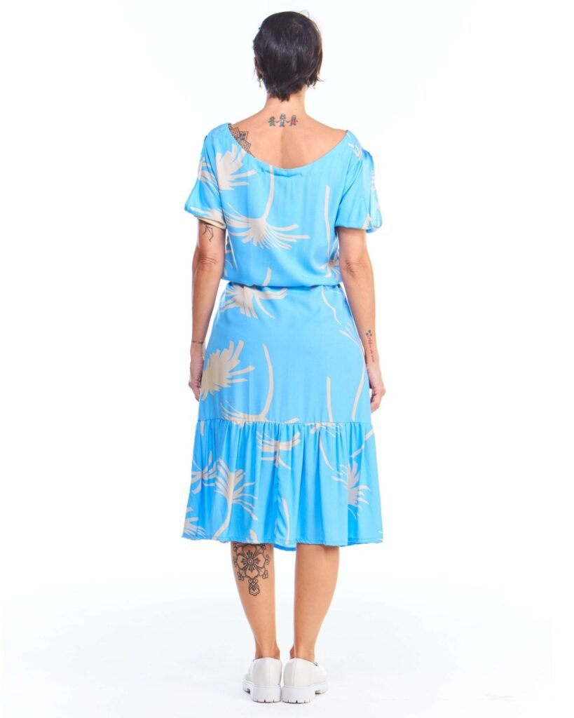 O tecido 100% viscose do vestido babado azul estampado é outro grande atrativo. A viscose é um material leve, fresco e com ótimo caimento, proporcionando um toque suave e delicado à pele. Por ser um tecido respirável, essa peça é ideal para os dias mais quentes, pois oferece conforto durante todo o uso, sem causar desconforto. Além disso, a viscose tem a vantagem de ser fácil de cuidar, tornando a peça prática para o dia a dia.