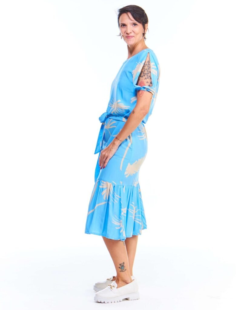 O babado na parte inferior do vestido babado azul estampado é o detalhe que cria movimento e romantismo a cada passo. As pences no busto moldam o corpo com delicadeza, e a faixa ajustável permite diferentes formas de amarração, dando liberdade para adaptar o look ao seu estilo e à ocasião.