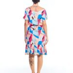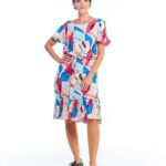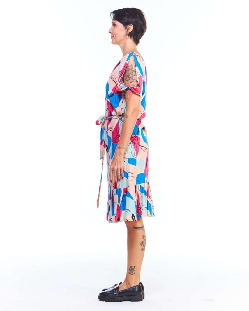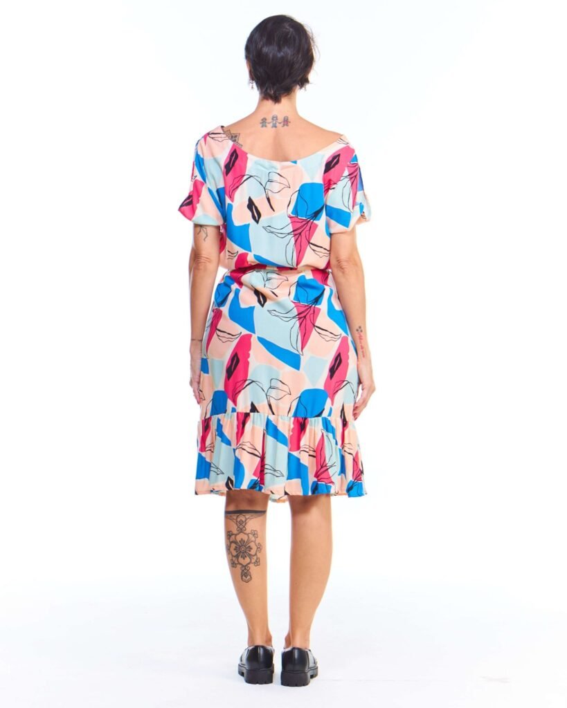 O vestido babado colorido estampado é a peça perfeita para quem busca leveza, movimento e feminilidade em um só visual. Com comprimento midi, gola canoa, mangas curtas com fendas e babado na barra, ele conquista pelos detalhes que valorizam o corpo com sutileza. As pences no busto garantem um ajuste elegante, enquanto a faixa de amarração na cintura traz charme extra à composição.
