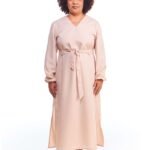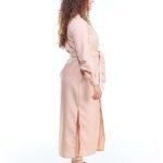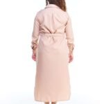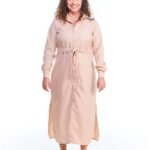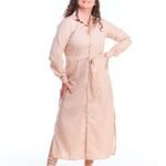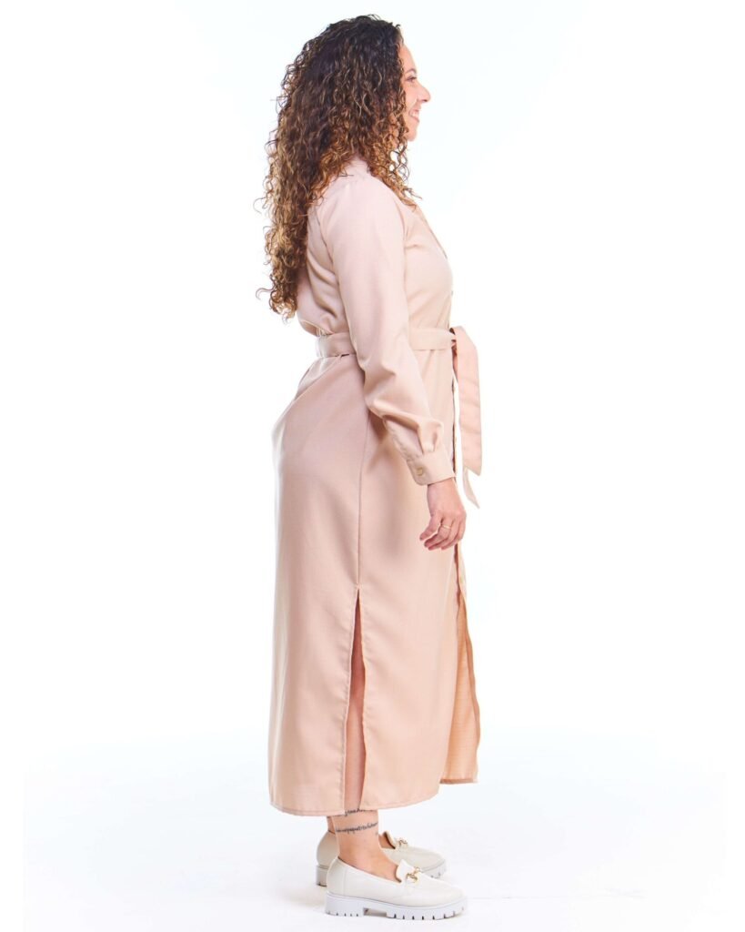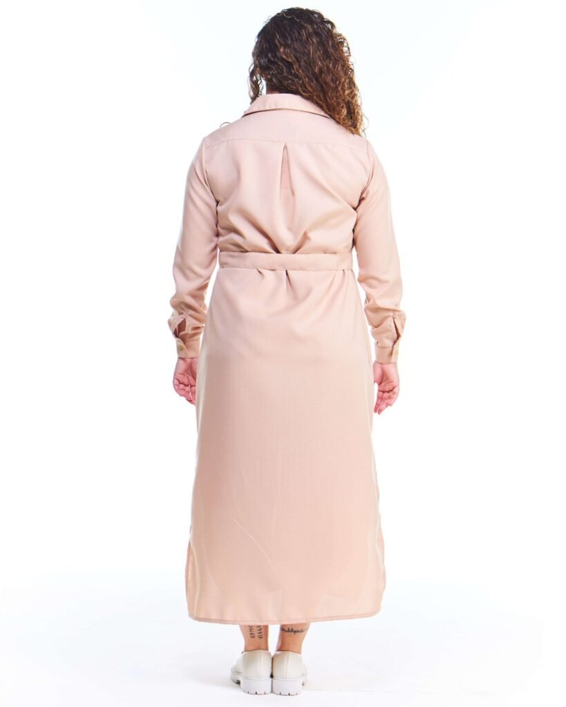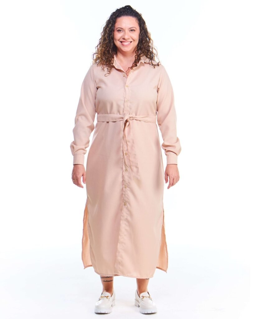 O vestido chemise linho fake bege midi manga longa possui comprimento midi, gola de camisa, pences de busto, fendas nas laterais da perna, fechamento de botões na frente e nos punhos, acompanha faixa de amarração para a cintura e é feito em tecido 100% poliéster.