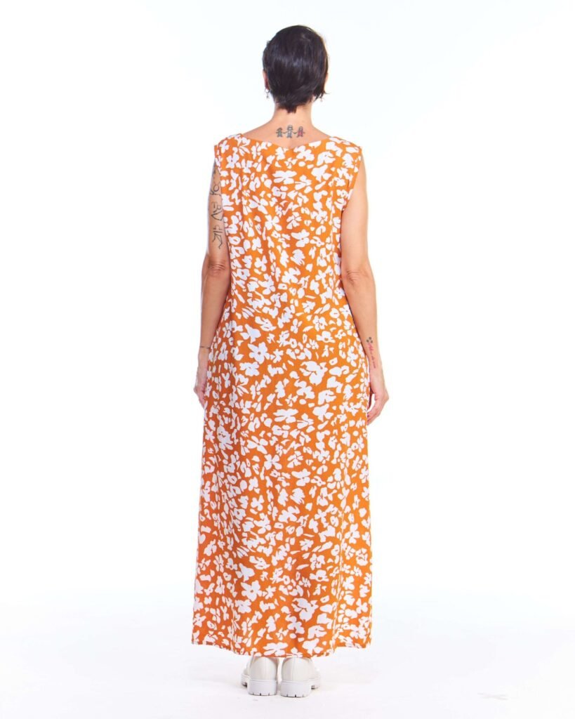 O vestido regata estampado mostarda midi de viscose apresenta um corte que equilibra feminilidade e conforto em uma única proposta. A gola V confere elegância ao colo e o recorte princesa na parte frontal valoriza a silhueta com sutileza, destacando as curvas de forma natural. A modelagem sem mangas oferece leveza e liberdade de movimento, tornando a peça ideal para diferentes temperaturas e estilos de uso.